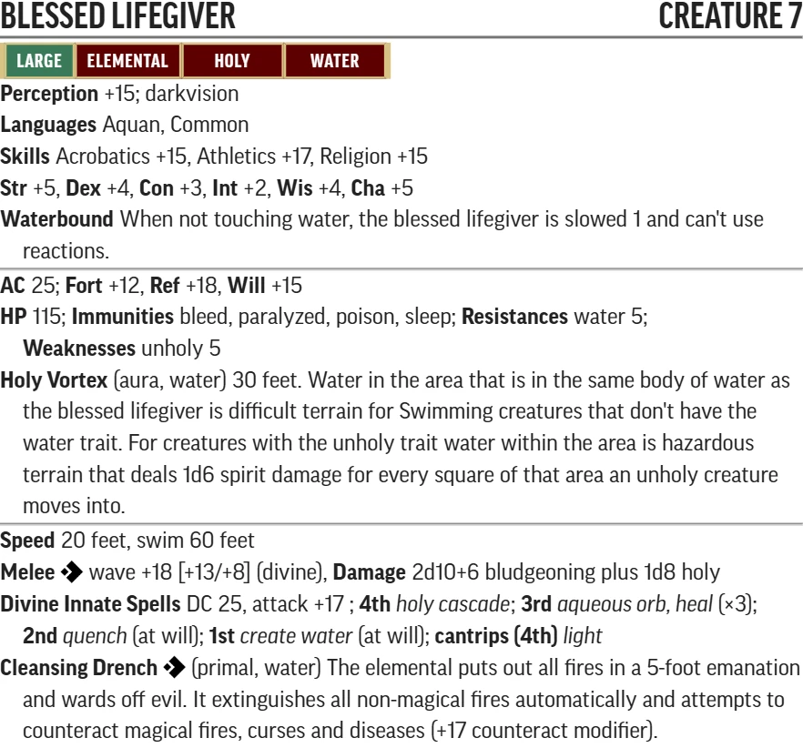 COMBAT: While they are usually placid, an enraged livegiver is capable of great buffeting waves or explosive cascades of holy water. Their waters can be stirred up into a holy vortex capable of washing away evil creatures, and they are able to extinguish magical flames. Tactically, they prefer to be in control: creating tidal bores which push enemies away from innocents, drowning or disarming them when necessary, but they’ll always trying to end a conflict with as little lasting harm to the environment itself as possible. Only when faced with implacable evils—like Olhydra’s cults or Kelizandri’s vile brine‑spawn—do they unleash their full tempestuous might.