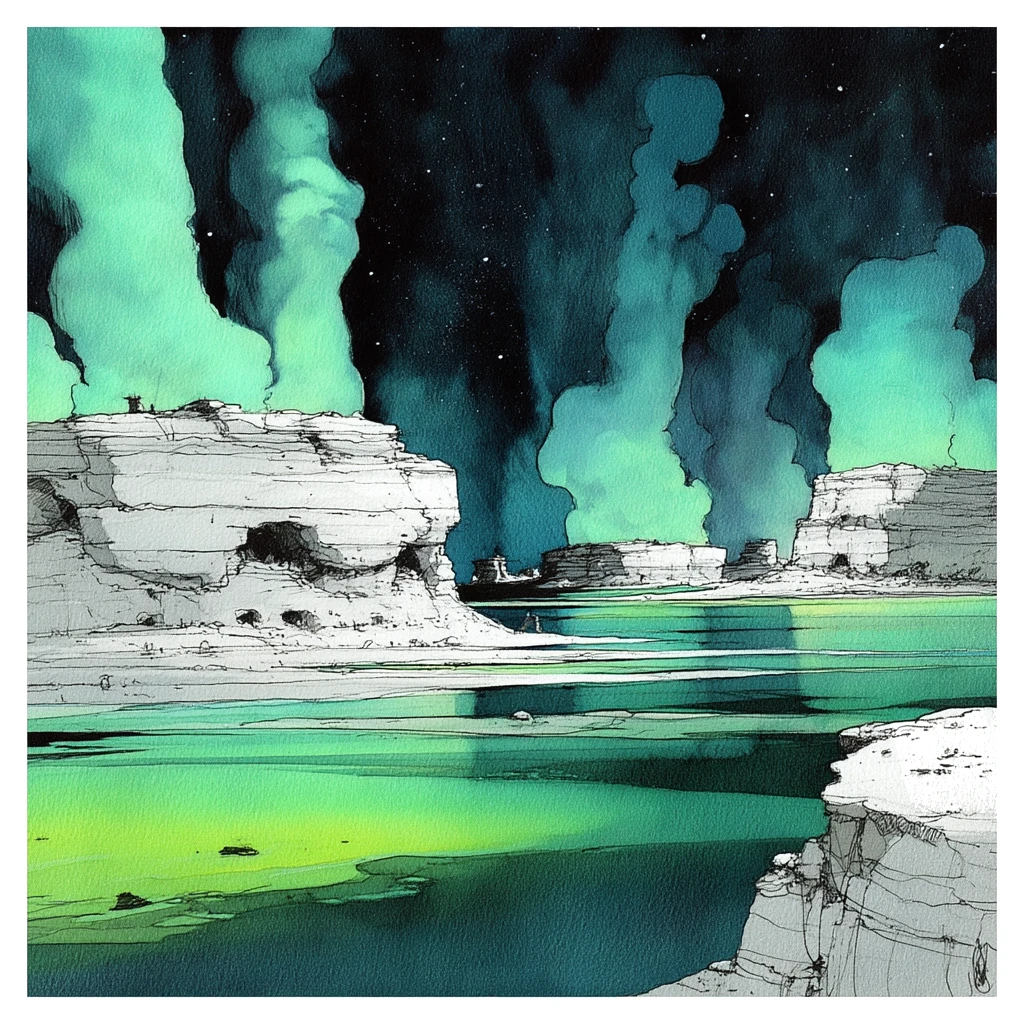 The Bleached Archipelago is scattered like a mouthful of broken teeth across the shallows of Burningwater, its islands bone‑white from the constant inundation by the acid sea and the corrosive vapours that rise from it. The land is low, flat, and strangely quiet, as if even the rocks have learned to hold their breath. The cliffs are layered with thin beds of the evaporated residue of the ocean, and the ground crunches underfoot. Tanar’ri raiding parties stage out of these islands, launching silently from hidden coves aboard glass shell-ships. Others are infested with vescavor hives. The archipelago is riddled with shallow caves where the acid has etched the rock into strange, looping tunnels that make horrible moaning sounds when the wind blows through them. Most unsettling of all, the nights here are lit by a faint, sickly phosphorescence in the shallows—colonies of tiny, stone‑shelled organisms that feed on the bones of Addanc’s victims and glow a pale green whenever the burning tide uncovers their feeding grounds.