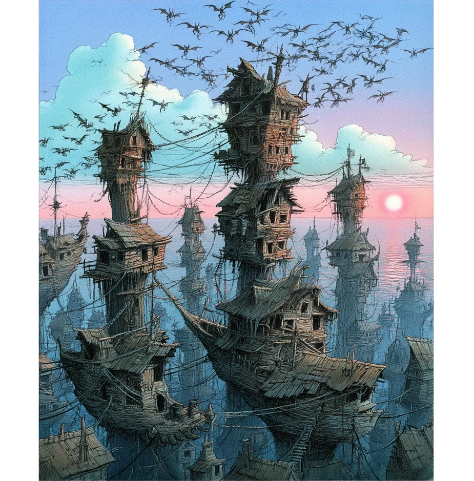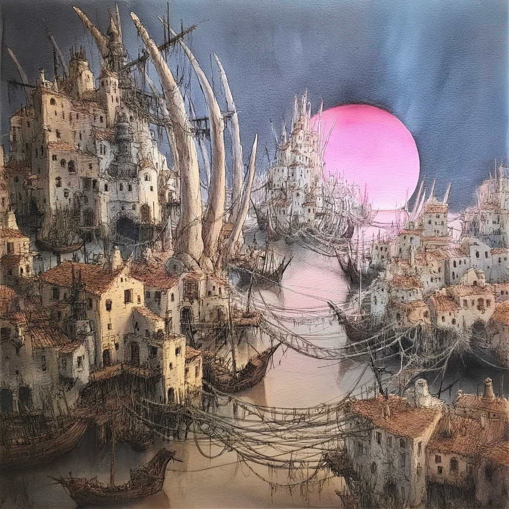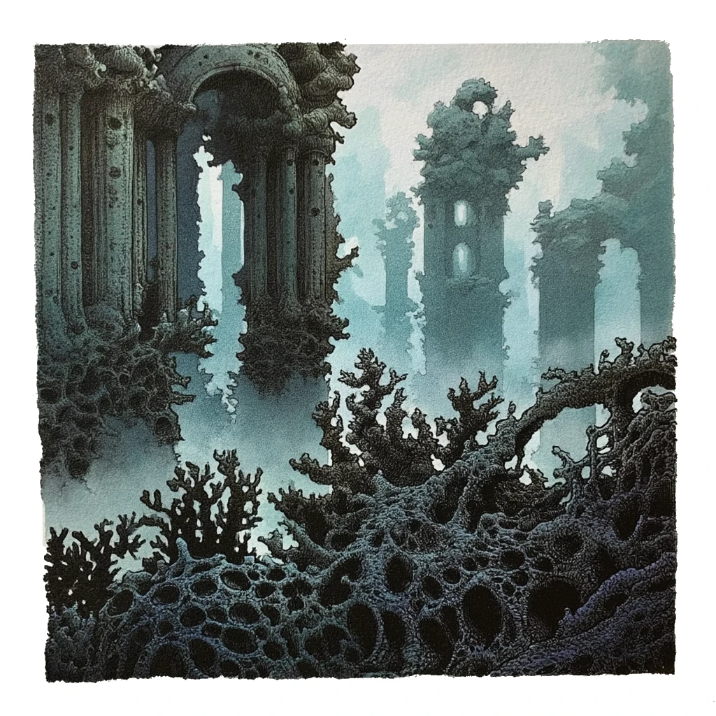 Ciccarone rises out of the sea like a drowned rat left to fester in the shallows. Built across perhaps one hundred small islands, it has acrid canals instead of roads. They are clogged with the skeletal ribs of beached whaleships and the white shells of dead crustaceans. The burg’s many towers of coral and stone lean at angles that gravity would forbid in any sane world. Bridges sag between buildings, their arches half‑eaten through. The widest waterways are spanned by tattered nets of black sinew that creatures must clamber across. The burg’s narrow alleys are a maze of dark, water‑stained ginnels and raised walkways slick with brine and algae. They echo with the clicks and scrapes of the mutated crustaceans that have learned to crawl up the walls like oversized, predatory barnacles.