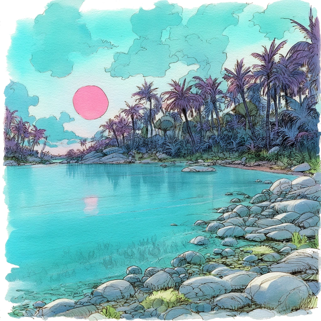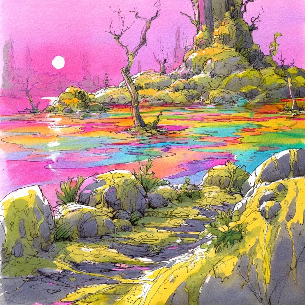 The Sea of Eosvotti [ay-oss-VOTTY] is an endless, undulating expanse of greenish‑acid water that stretches to the ragged, acid‑clouded horizon in every direction. The islands of the Bleached Archipelago and the burgs of Ciccarone and Olhado float upon it like scabs on a puddle. From a distance, the sea appears almost tranquil, its surface reflecting the pink sun in broad, rippling bands of rose and gold, the cyanic clouds overhead drifting lazily. The air is warm and humid, although it carries the faint, cloying sweetness of something long-spoiled. The water is deceptively clear, the blue‑green depths seemingly inviting, the kind of sea that might lure an addle-coved marid from the Elemental Plane of Water into its embrace…