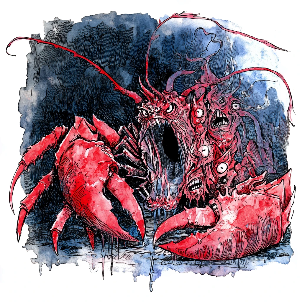 These pits seem almost sacred to the glass‑shelled crustaceans of the Ninth Layer. The mutated lobsters, shellfish‑like horrors, and armoured fish gather in dense congregations around the vents, treating the acid plumes like unholy fonts. They cluster just outside the currents, the acid burning streaks into their carapaces, and they raise their pincers in slow, rhythmic motions that resemble dance or even prayer. Some of the largest specimens stand on the very edges of the fissures, riding the updrafts like aquatic birds. Their bodies might etch thinner with each exposure but their eyes gleam with the agony of fanatics. They know, like their lord Addanc, that if the pain doesn’t kill them, then it will only serve to make them stronger.