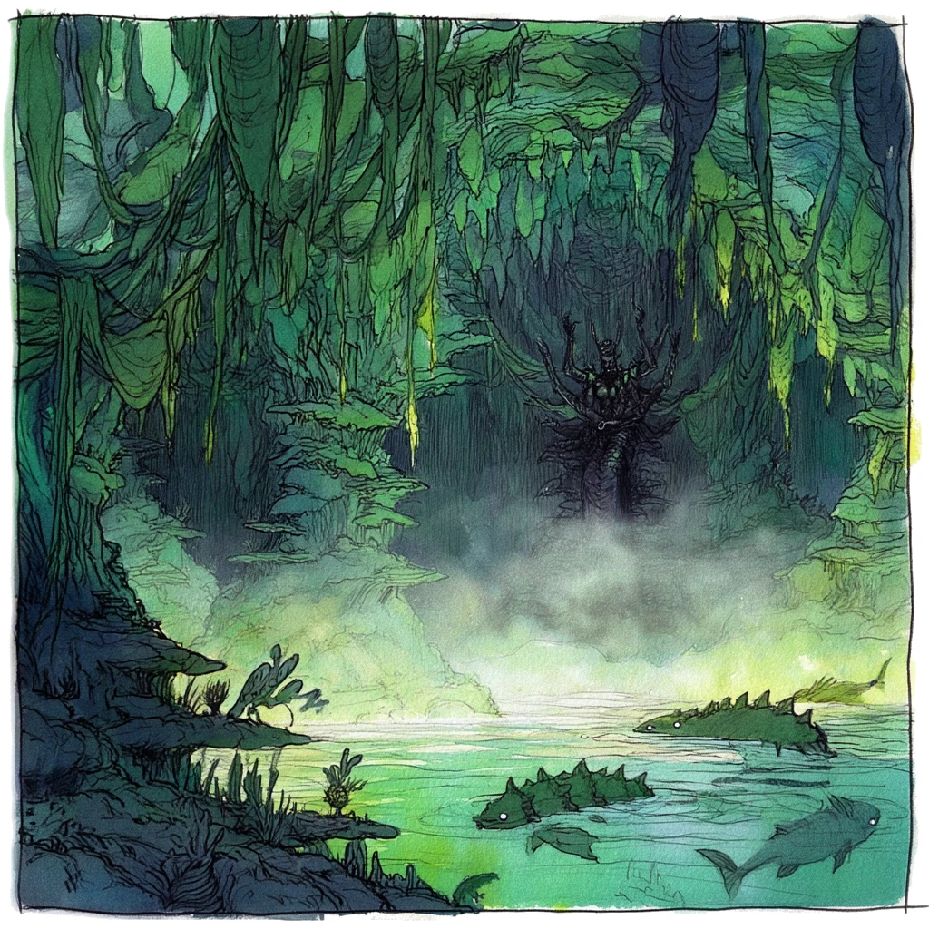 A crumbling sea cave carved into the underside of one of Burningwater’s more precarious islands, the entrance to Ilmurrath’s Grotto is shrouded by a curtain of foam that hisses as it falls back into the sea and glazes the surrounding rocks with an iridescent patina. The walls of the cavern are ribbed with layers of coral and stone that have warped into shapes resembling cages, twisted through with thick veils of slimy kelp‑like growth that pulse with a faint, sickly light. The grotto’s floor slopes down into a central pool of the acid, deeper and colder than the surrounding shallows and where the surface is often broken by the slow, heavy circling of armoured fish-with-claws that serve as Ilmurrath’s private guard, their eyes glowing in the gloom. The grotto’s ceiling is strung with stalactites of salt‑crusted minerals, natron spikes which could make fine weapons. Ilmurrath (planar marilith tanar’ri [she/her] / CE) broods on a half‑sunken throne, her serpentine form shrouded in the perpetual mist of the place. She’s an exile from the Shadowsea, although what she did that angered Dagon, or how she survived his wrath, are both dark. She’s more than half-barmy now from the fumes, but has managed to attract a small cult of equally crazed merfolk petitioners who’ve sworn fealty to her.