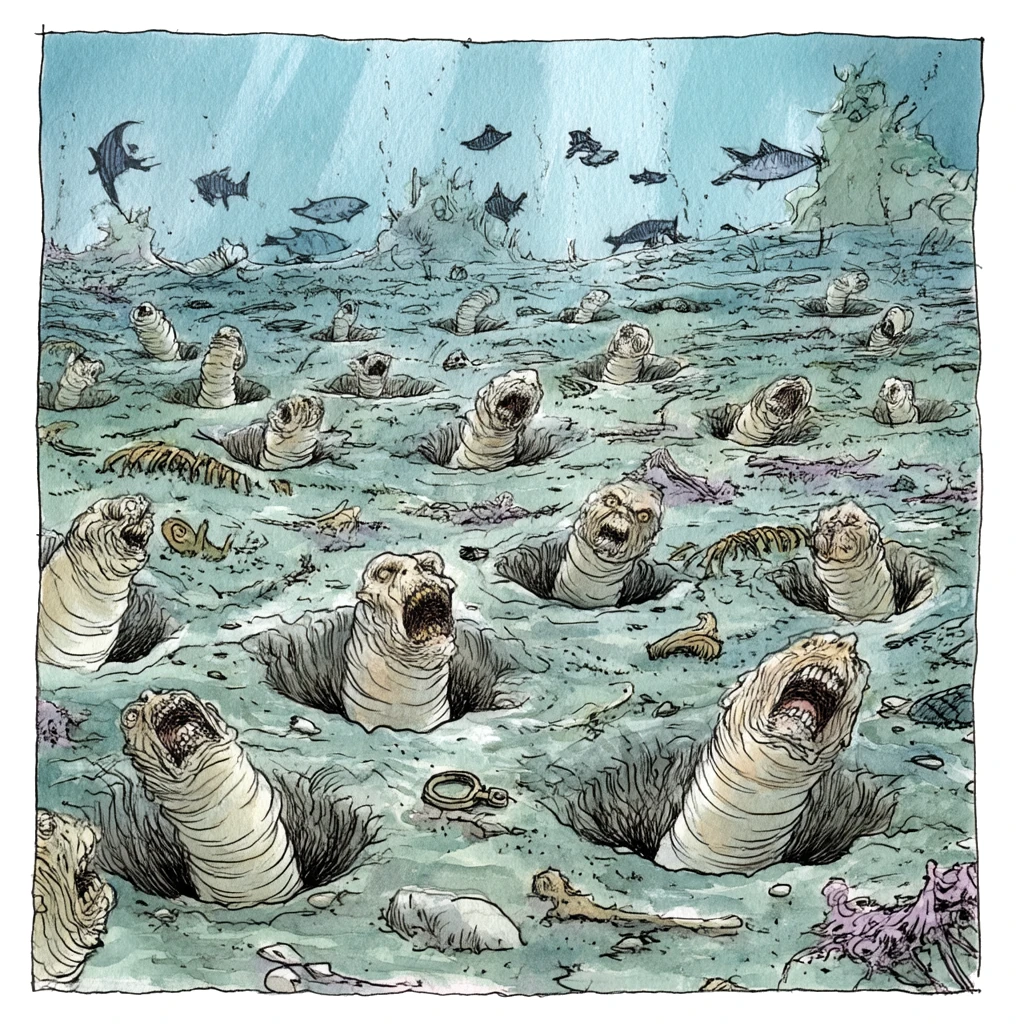 The Larval Bore is a slow, ceaseless current that coils through the deeper trenches of the Sea of Eosvotti like a hungry serpent. Its surface is oily with the detritis of the sea and its depths roil with the bloated shapes of Addanc’s drowned victims and the larvae they are becoming. The tidal bore moves with a terrible, unhurried rhythm that drags the swollen corpses of fishers, sailors, and failed planewalkers down into the dark where the ‘water’ is thickest, and the light of the pink sun cannot reach. The sea-floor here is lined with pock-marked larvae pits, hollows in the rock that are overgrown with pulsing, worm‑polyps that feed on the flotsam of the tide. A carpet of half‑dissolved fragments remains, the bones of the drowned picked clean and then picked clean again, until only milky shells of calcium and the occasional tooth or buckle remain. The larvae themselves float in dense, shifting shoals, their bodies translucent, their tiny mouths twitching with needle-teeth as they strain the sea for the faintest trace of flesh. When the tide surges or the sea shudders from one of Addanc’s distant storms, the larvae rise in a writhing, living wave, mouthes upward, as if even the acid water itself was a thing they can devour. The Larval Bore is an ever-hungry throat, well—a million throats—a slow devouring abyss within the Abyss. To drift into its current is to be swallowed, digested, and then, if the powers are in a cruel mood, returned into another form entirely.