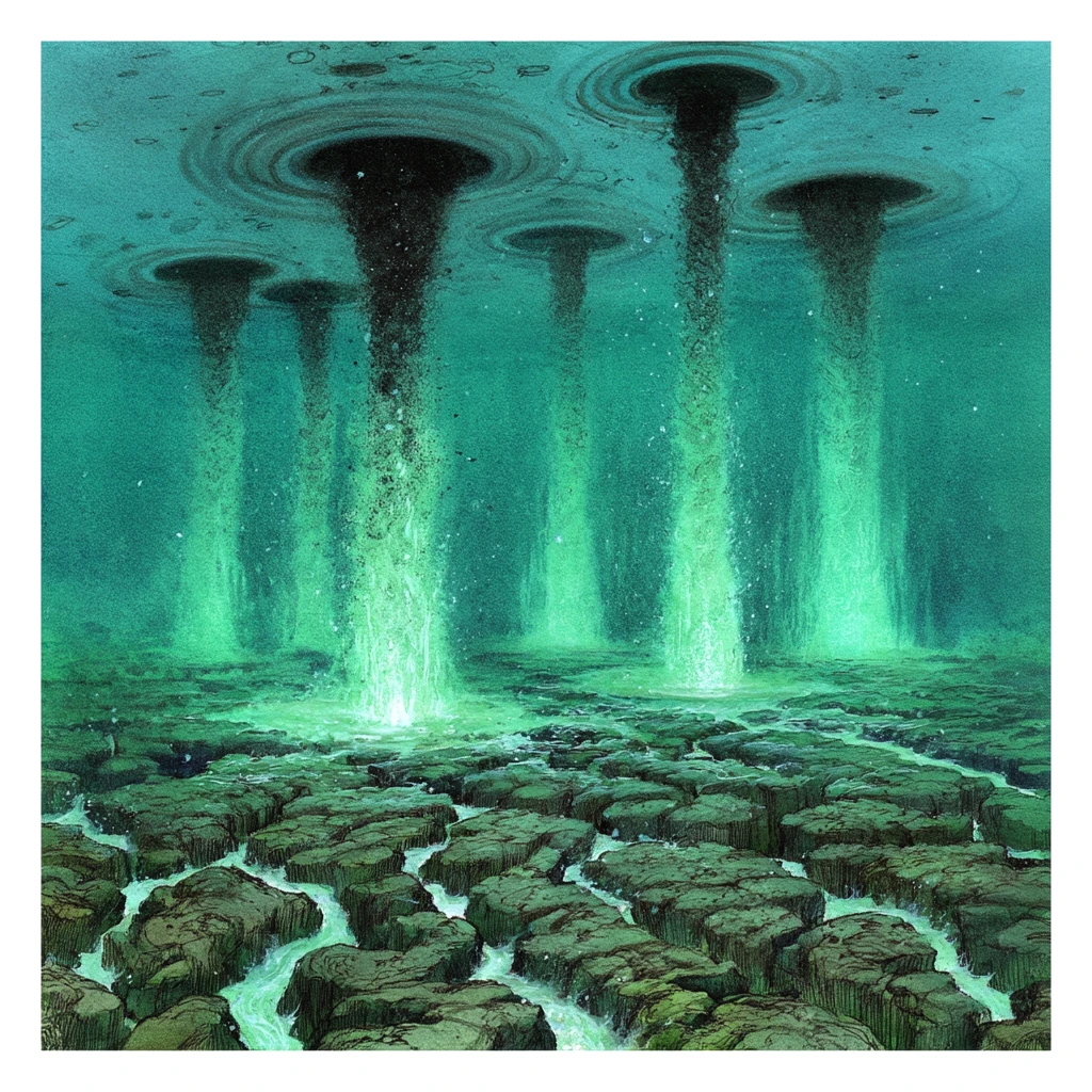 The Vents of Vitriol are a series of fissures which snake across the deep sea floor of the Sea of Eosvotti, where the Abyssal crust has cracked open and the layer is turning itself inside‑out. Boiling plumes of concentrated acid erupt upward in columns, their edges shimmering with heat‑distortion halos and their cores a seething, emerald‑green so intense it looks almost alive. The water around the vents roils in a constant churning updraft, the current tugging anything loose like the Abyss is trying to drink the sea itself. The rock around the fissures is pitted and warped, and streaked with mineral veins that glow in the perpetual gloom. The Vents are not quiet; the sound of them hissing and crackling echoes through the water for many leagues.