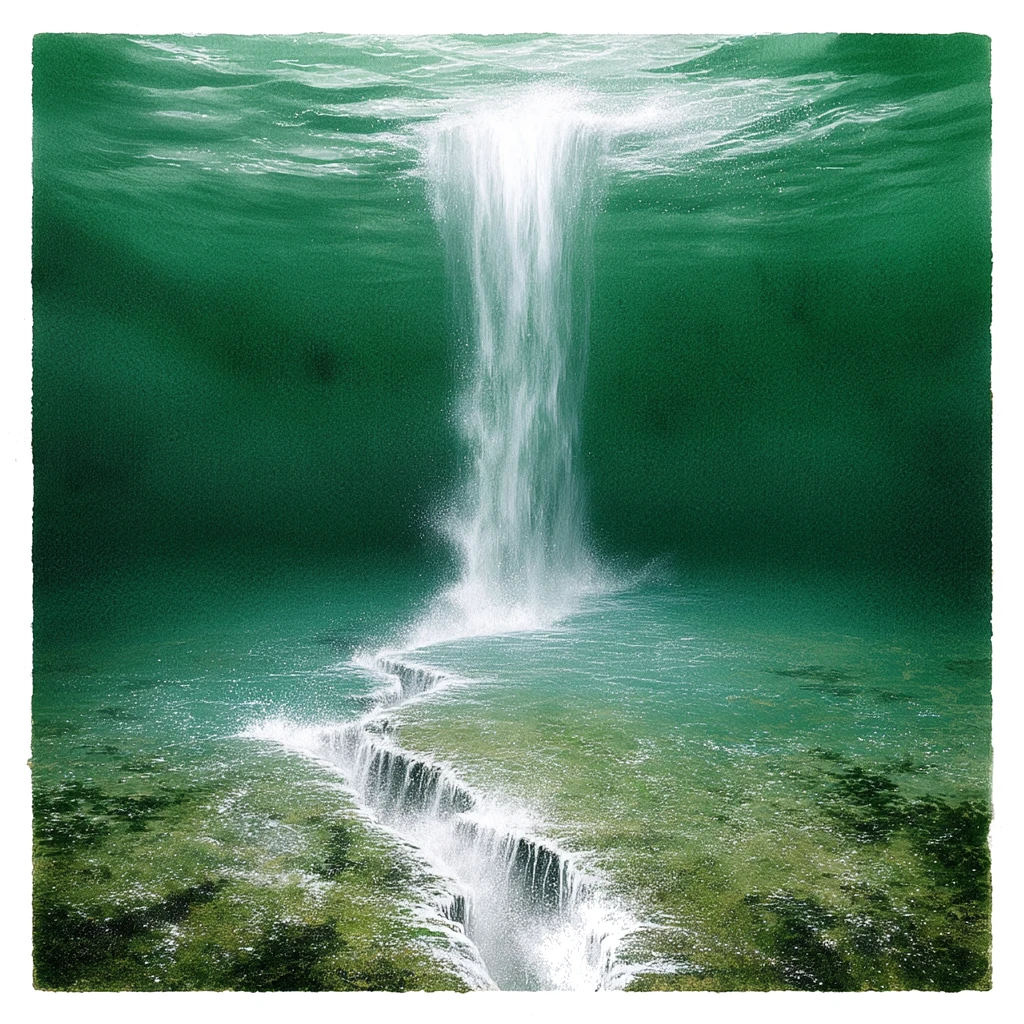 The Weeping Wound is a jagged, ragged tear in the sea floor not far from the dissolving foundations of Stinking Pearl, a place where the Abyssal bedrock has been ripped open by some tremendous, ancient violence and has never managed to heal. The edges of the fissure wound are coated in a strange, slick, whitish mineral that glistens like frost despite the sea’s heat. From its depths, every so often, come slow, pulsing jets of effervescent fluid that rise toward the surface in trembling columns. The sea around the wound is unnaturally quiet—the usual skittering of crustaceans is silenced here, as if the place is holding its breath.